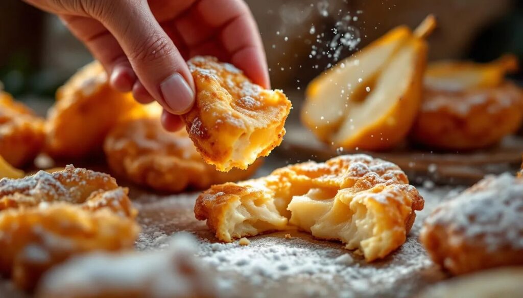 Questa versione punta sulla velocità senza rinunciare alla consistenza soffice che fa la differenza tra una frittella qualunque e una da ripetere ogni settimana. La pastella è volutamente leggera, quasi una crema, perché il segreto sta nel lasciare che la pera rilasci i suoi succhi nell'impasto durante la cottura. Il risultato è un boccone che si scioglie in bocca, con una nota dolce naturale che riduce la necessità di zucchero aggiunto. Raccogliete le pere migliori che trovate al mercato — sono ancora disponibili le varietà invernali tardive come la Kaiser e la Abate — e preparatevi a sporcarvi le mani di pastella.